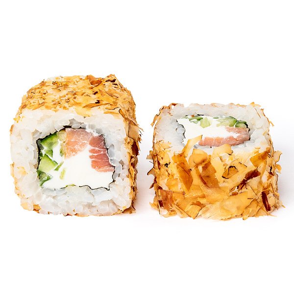 4. роллы Бонито: рис миксованный, нори, сыр Креметта, лосось жареный (стейк лосося, соус барбекю, шрирача, жидкий дым), бонито стружка, огурец свежий.