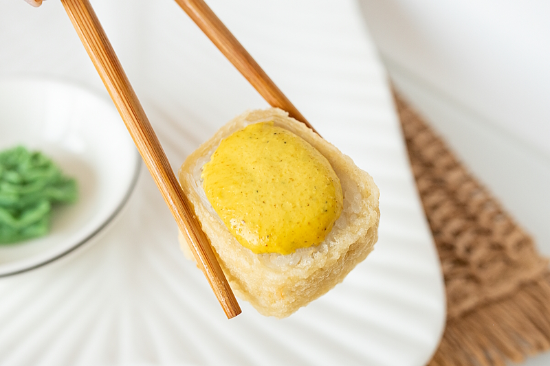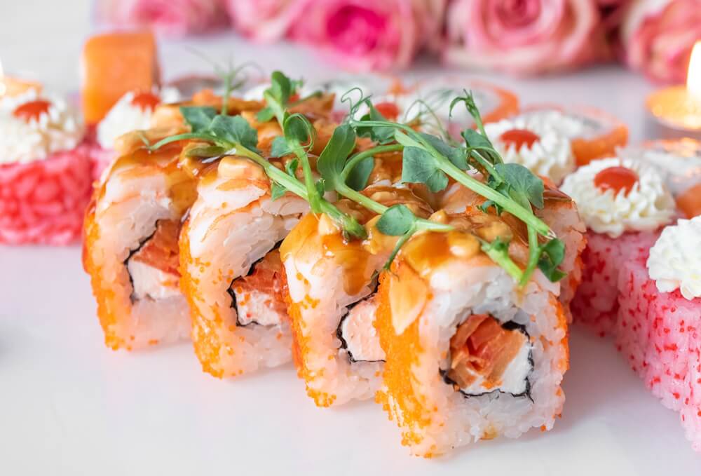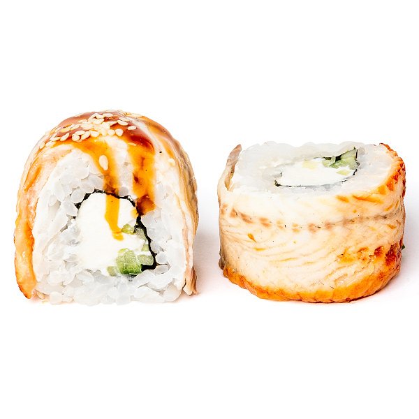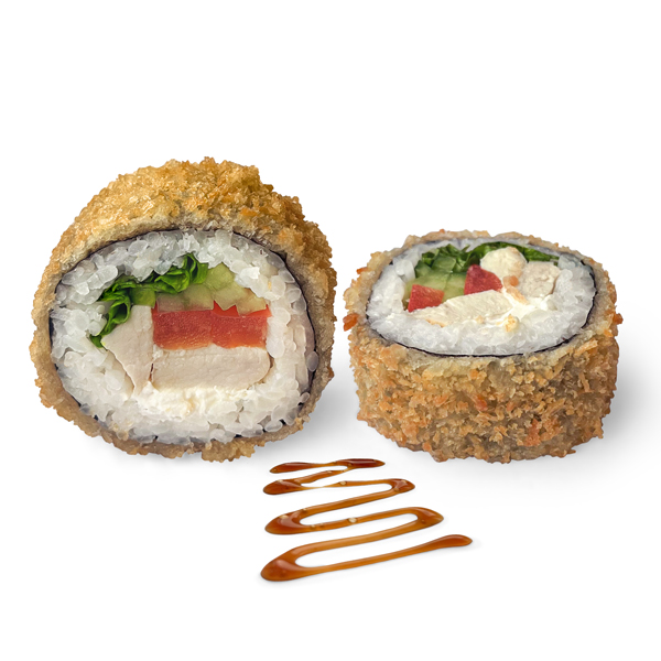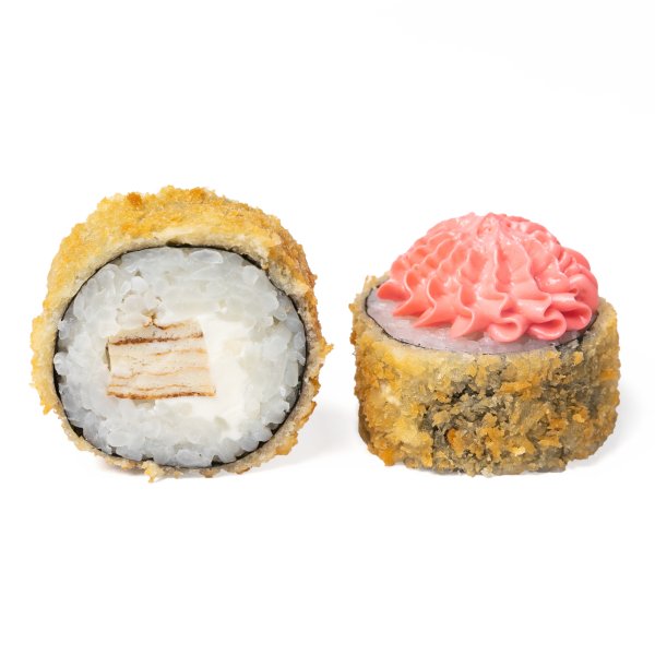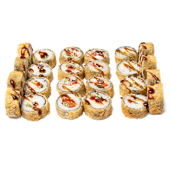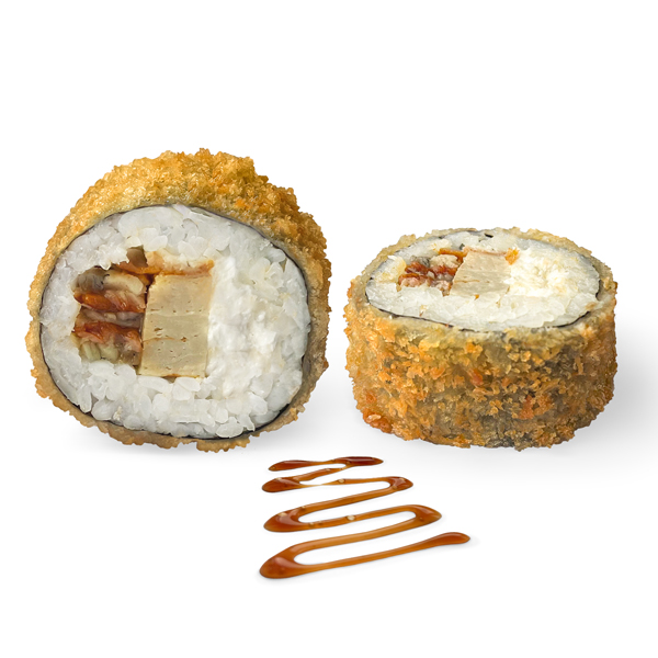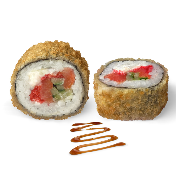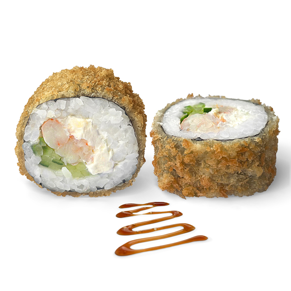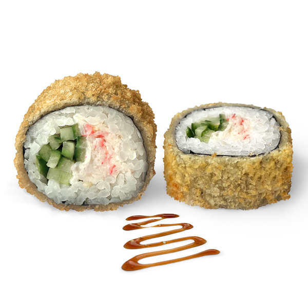 7. роллы  Темпура Гейша: рис миксованный, нори, сыр креметта, лосось премиальный, кляр (мука, яйцо, вода, крахмал картофельный), сухари Панко, огурец свежий, масло фритюрное, икра масаго, соус Унаги.