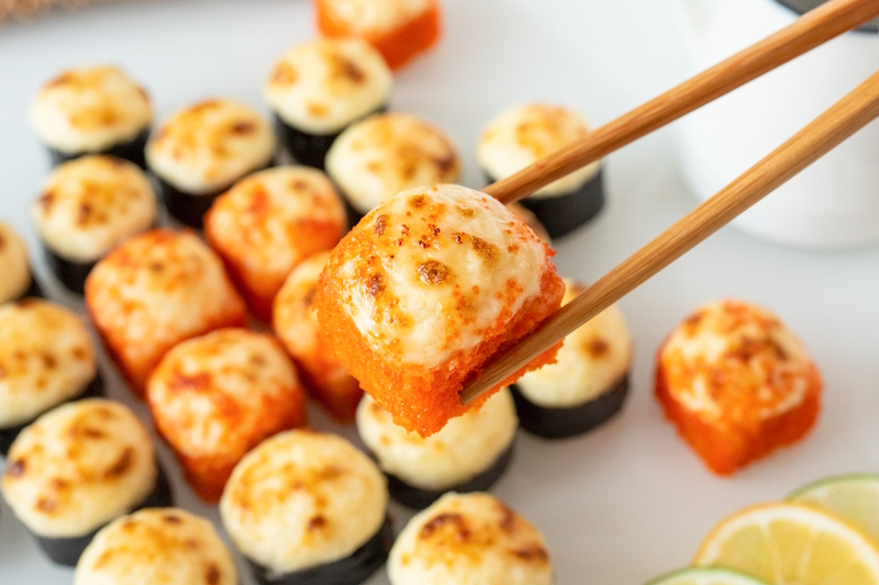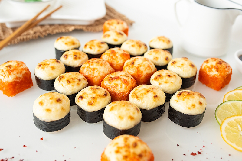 3. роллы Гейша Хот: рис миксованный, нори, сыр креммета, лосось премиальный, огурец свежий, сырная шапка (майонез 67%, сыр пармезан), шрирача.