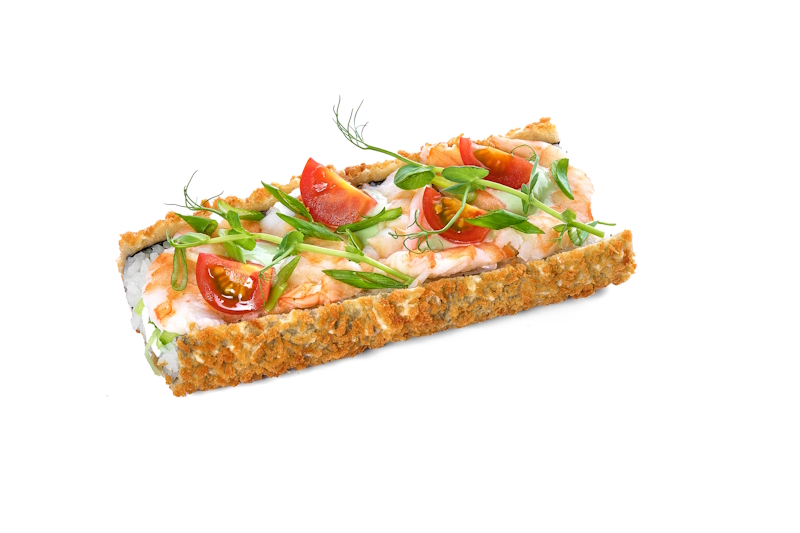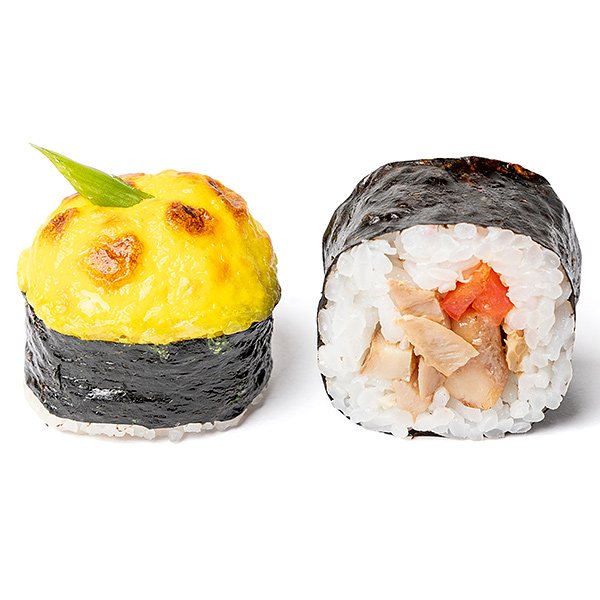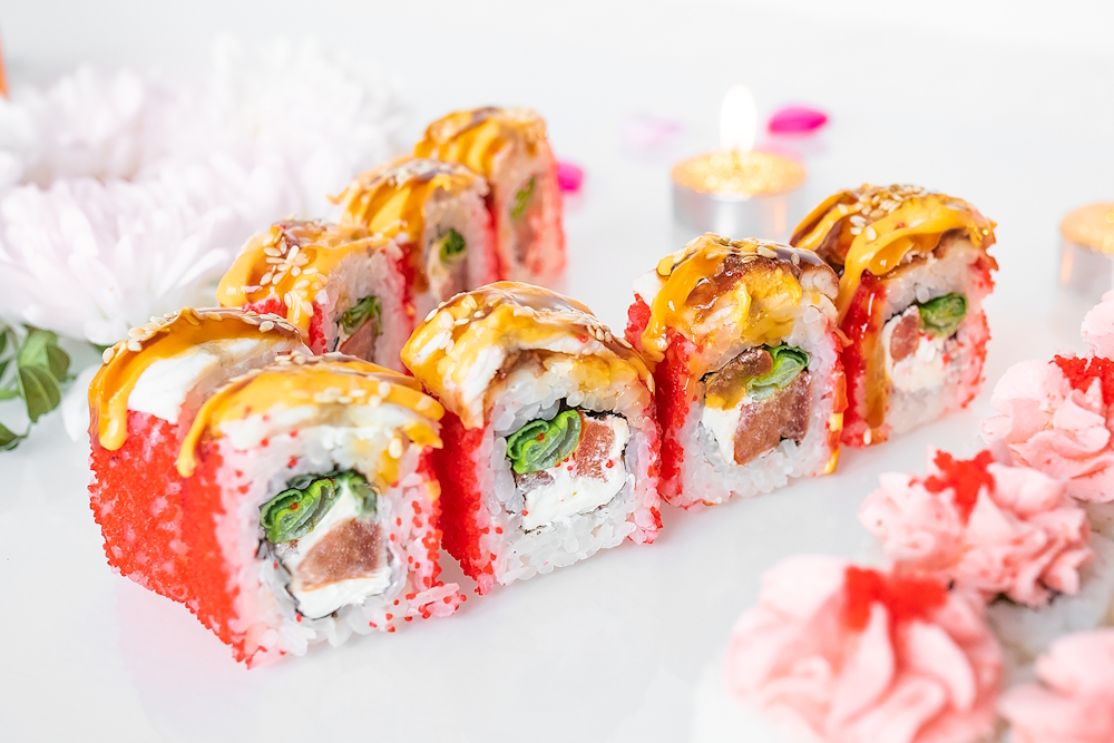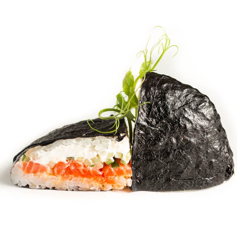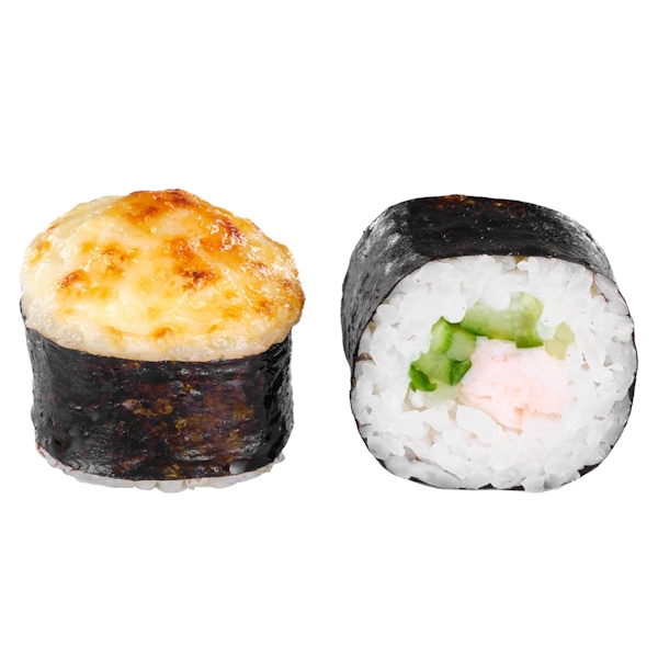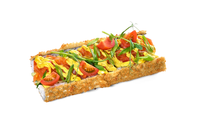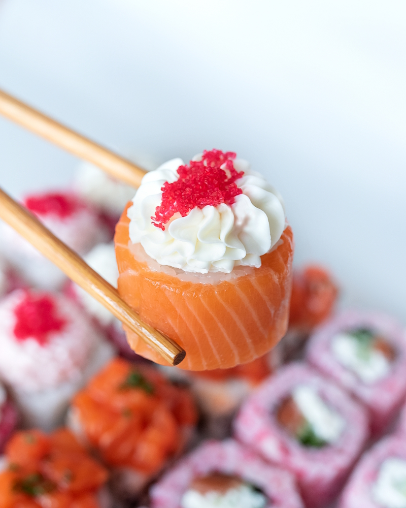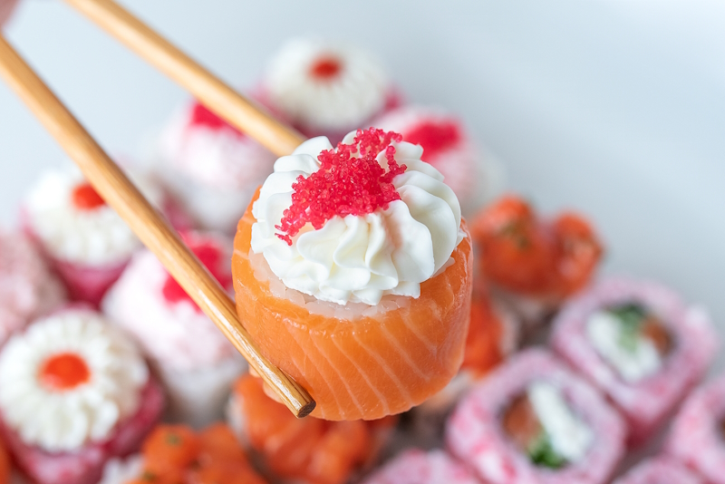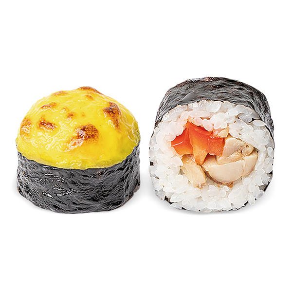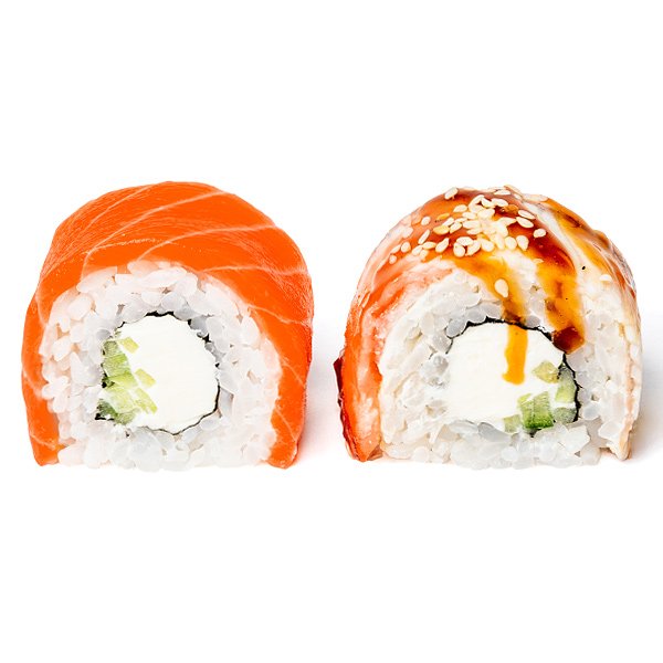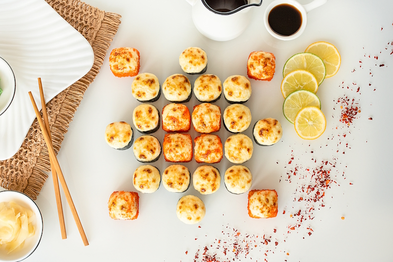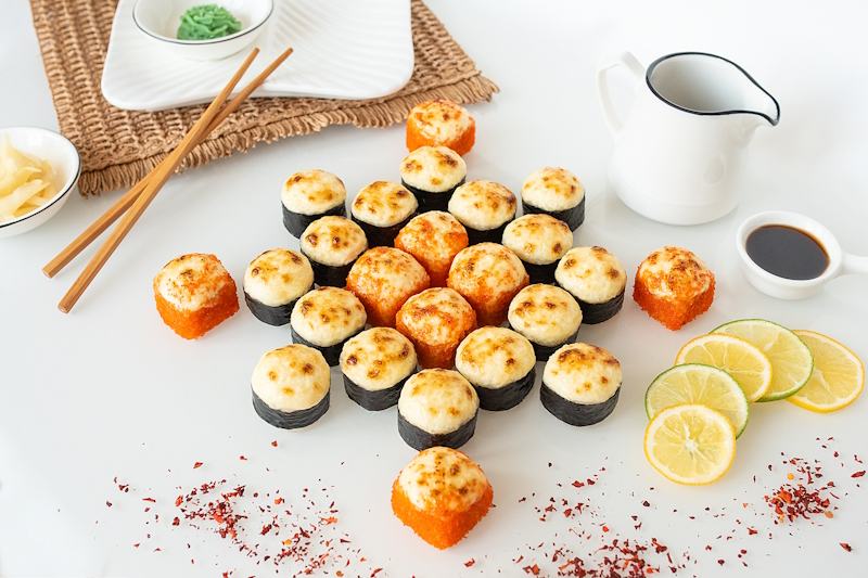 1. роллы Асахи: рис миксованный, нори, сыр Креметта, лосось жареный, шрирача, томаты, кунжут чёрный.