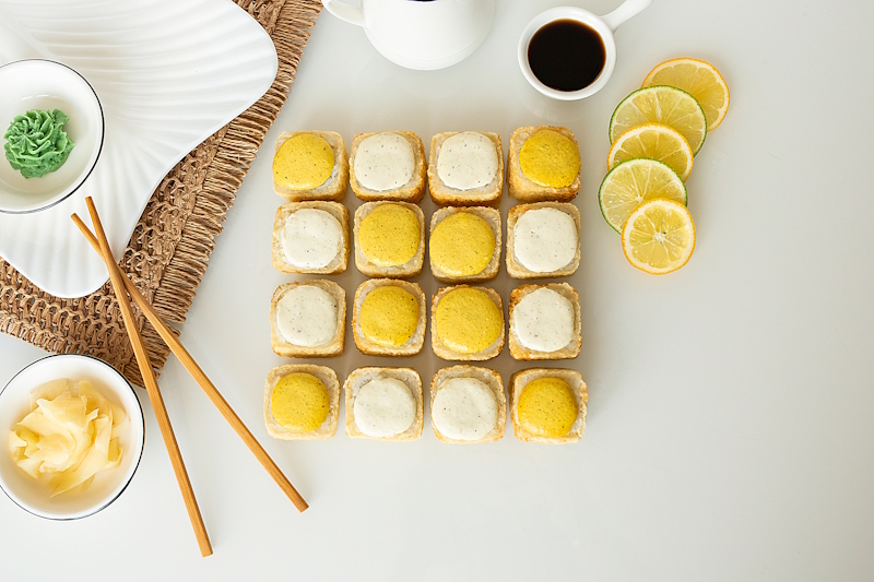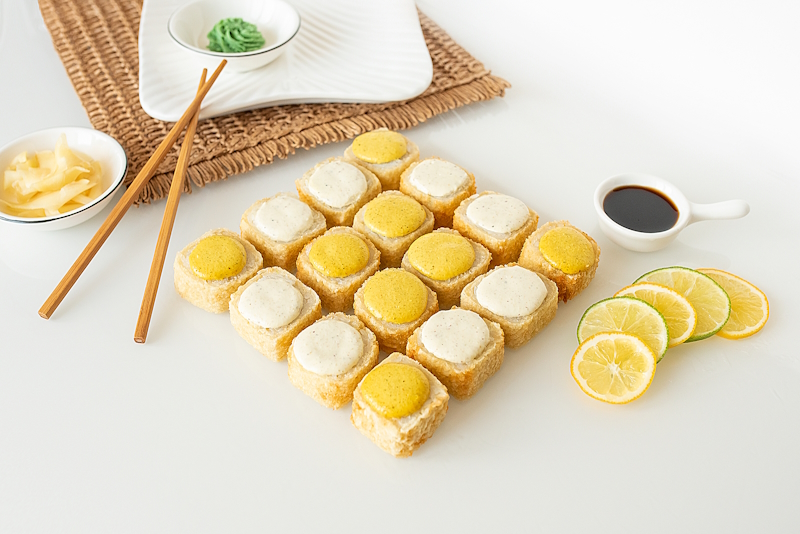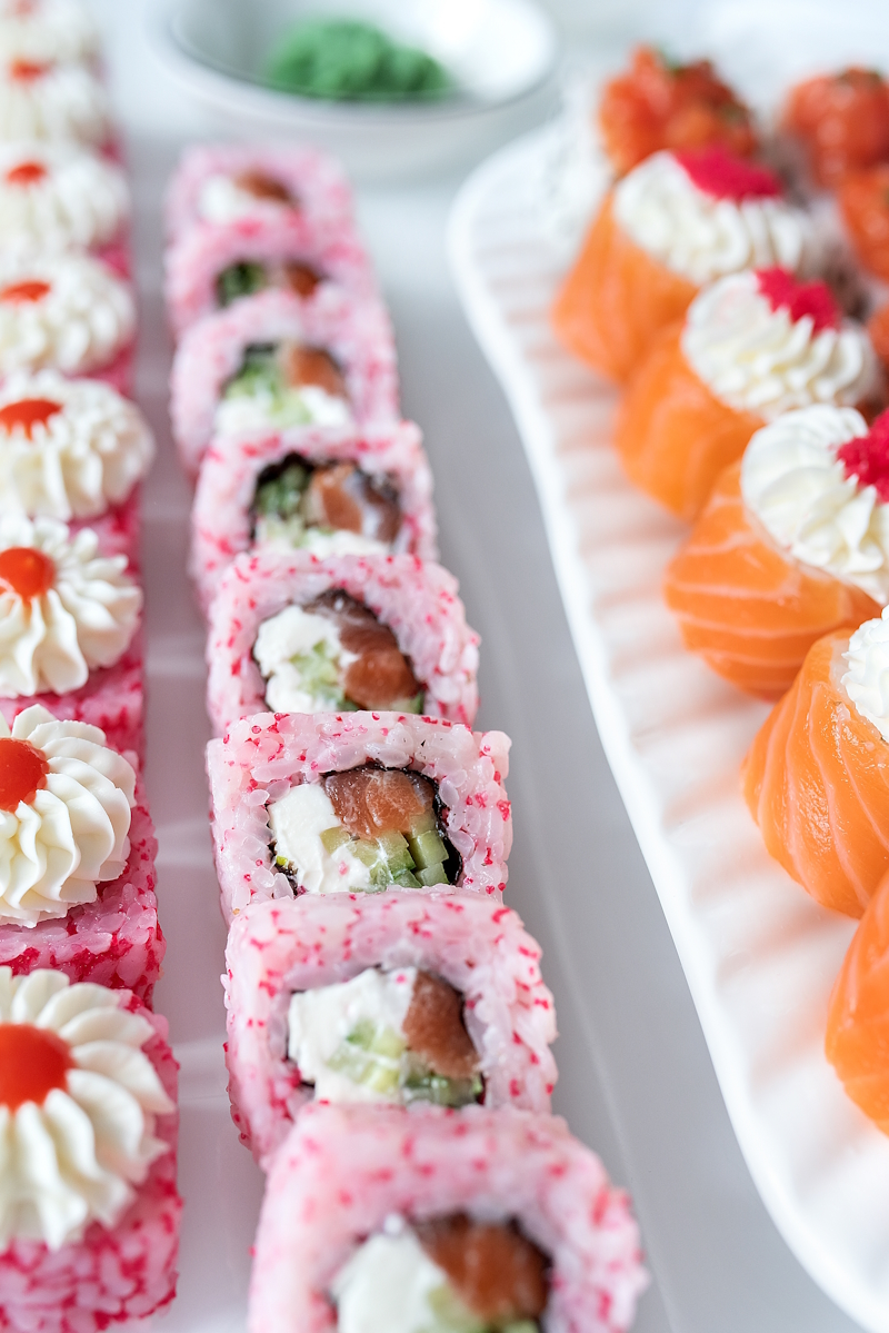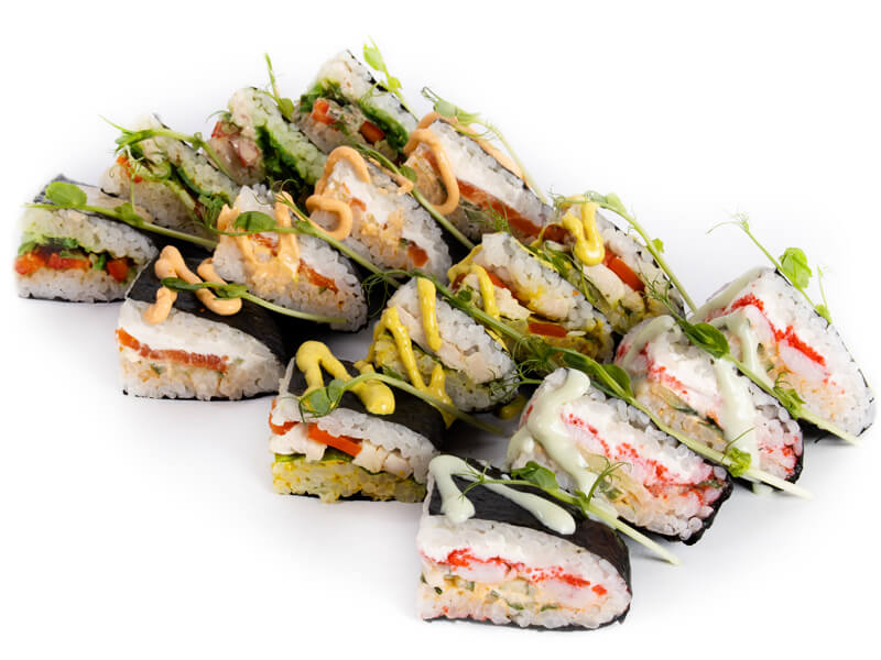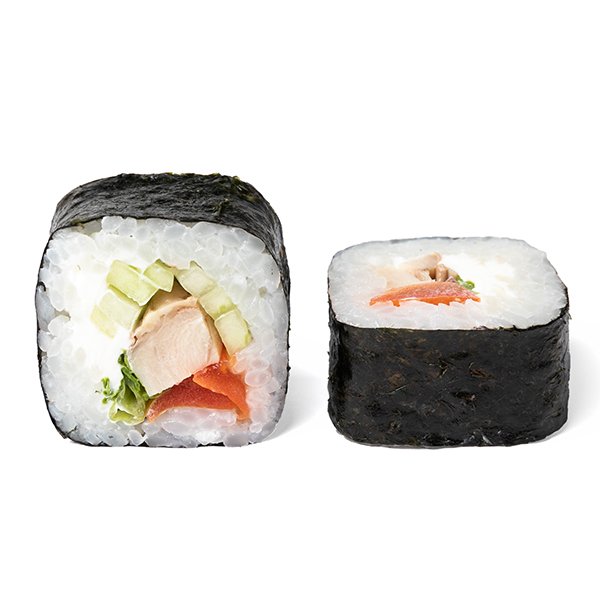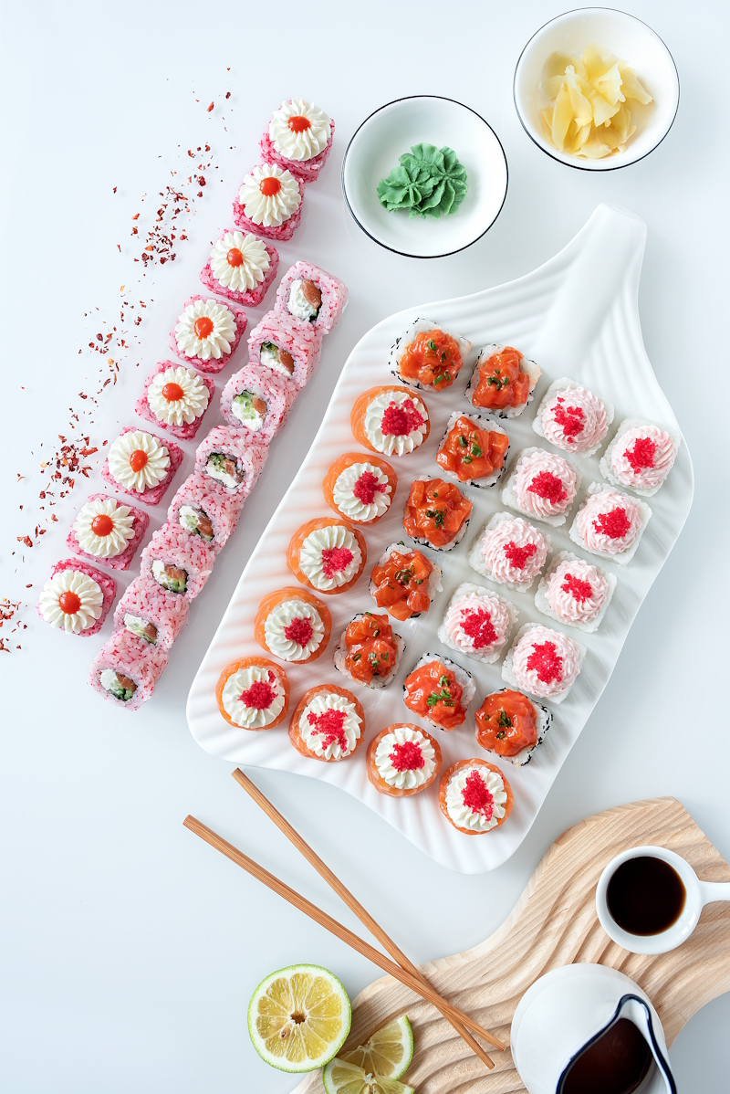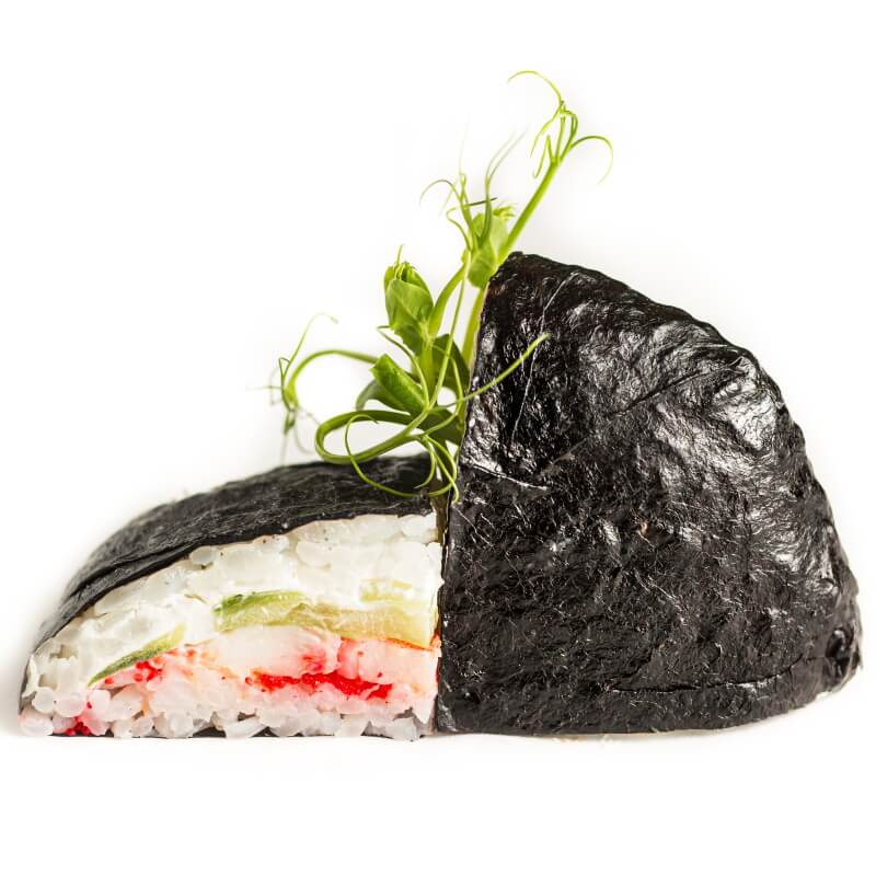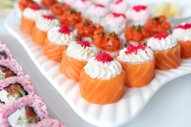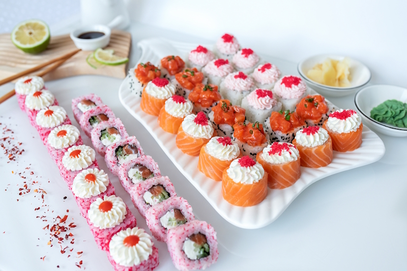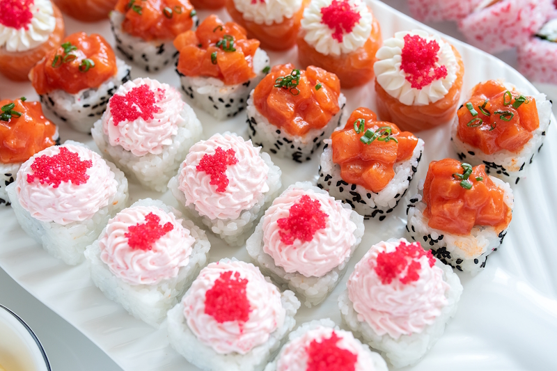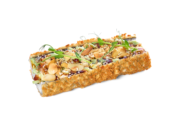 1. роллы Асахи: рис миксованный, нори, сыр Креметта, лосось жареный, шрирача, томаты, кунжут чёрный.