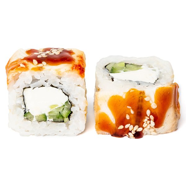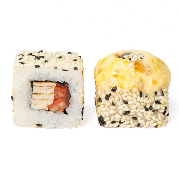 8. роллы Сноу биг гриль: рис миксованный, нори, крабовый замес (майонез 67%, снежный краб, сыр креметта, чеснок, кунжут белый), лосось жареный (лосось стейк, шрирача, соус Барбекю, жидкий дым), соус Унаги, сырная шапка (майонез 67%, сыр пармезан), кунжут белый.