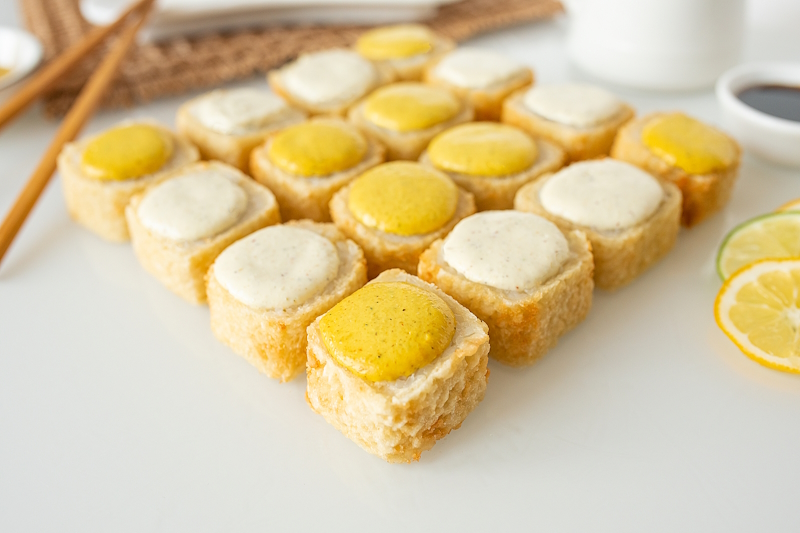 10. роллы Темпура BBQ: рис миксованный, нори, сыр креметта, лосось премиальный, кляр (мука, яйцо, вода, крахмал картофельный), сухари Панко, огурец свежий, масло фритюрное, икра масаго, соус Унаги.