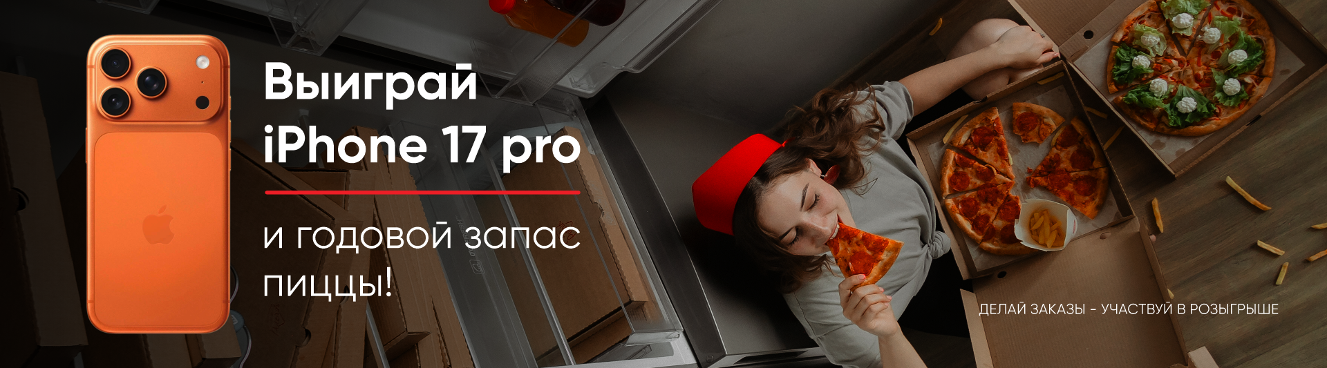 Розыгрыш для наших клиентов: оформите любой заказ от 1000 ₽ в период с 23 декабря по 15 января и автоматически станьте участником розыгрыша iPhone 17 Pro и годового запаса пиццы (2 пиццы в месяц). Победители выбираются случайным образом, итоги будут опубликованы в нашей группе ВКонтакте, с победителями мы свяжемся лично.