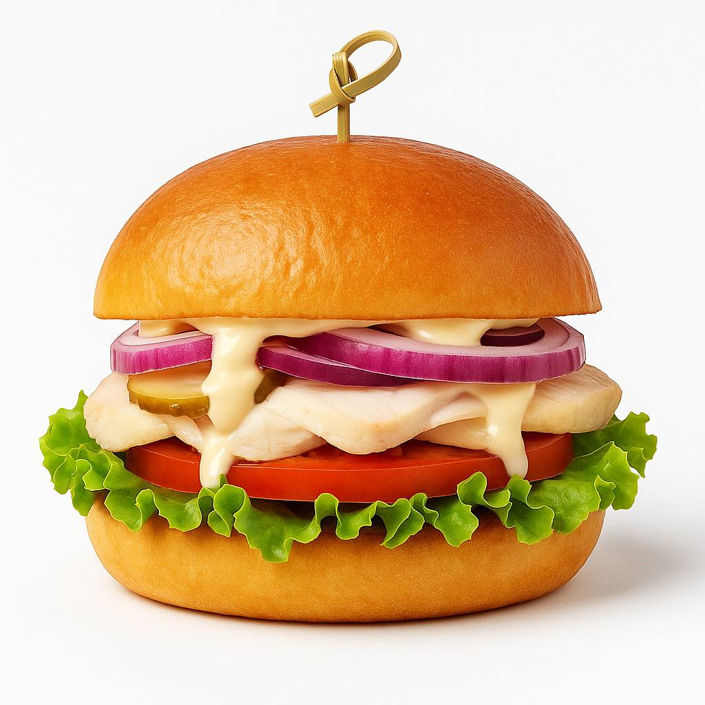 Кажется, в кого-то легко влюбиться. Сочная курочка су-вид, маринованные огурчики, грибочки, красный лук и свежий лист салата — всё под щедрой порцией соуса ранч и соуса Чеддер. Нежная, но с характером. В мягкой булочке, конечно.