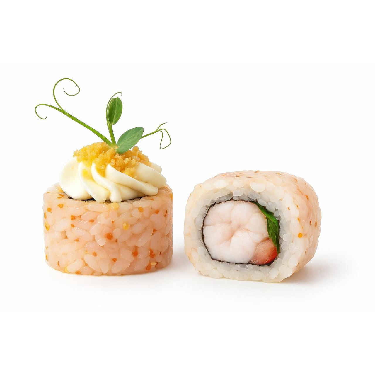 1. роллы Асахи: рис миксованный, нори, сыр Креметта, лосось жареный, шрирача, томаты, кунжут чёрный.